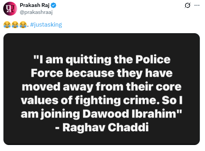 प्रकाश राज ने ट्विटर पर अपनी पोस्ट में लिखा, ‘मैं पुलिस फोर्स छोड़ रहा हूं क्योंकि वे अपराध से लड़ने के अपने वैल्यूज से भटक गए हैं। इसलिए मैं दाऊद इब्राहिम से जुड़ रहा हूं – राघव चड्डी।’ इसके साथ उन्होंने हंसने वाला इमोजी और #justasking भी लिखा।